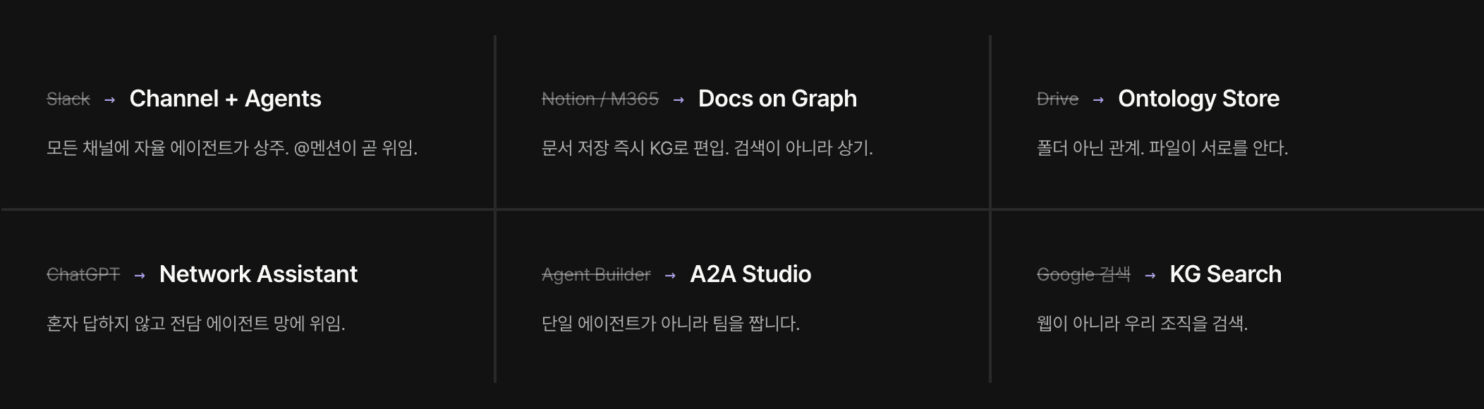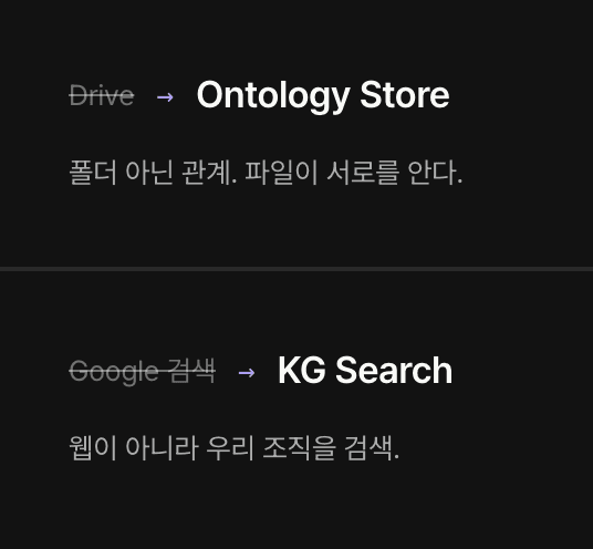 대화·문서·의사결정이 온톨로지로 축적되어, 시간이 지날수록 정확해지는 자체 검색망이 됩니다.
