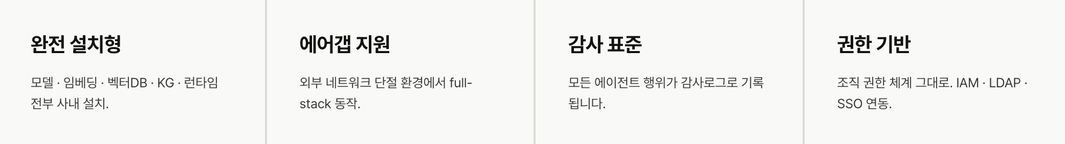 외부 유출 없는 폐쇄망 안에서 데이터와 에이전트가 연결되어 시모든 맥락을 축적해 우리 회사만의 기업지능으로 진화합니다.